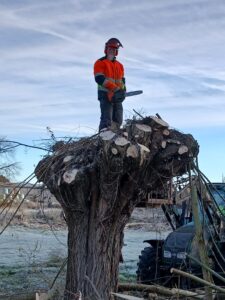 19.11.22. Samstag Vormittag. Das naßkalte Wetter konnte 16 Nabumitglieder und ihre Helfer nicht abhalten die Kopfweidenpflege fortzuführen. Insgesamt wurden 23 Kopfweiden zurück geschnitten, um so ein Auseinanderbrechen der Weiden zu verhindern und den Neuaustrieb im Frühling sowie das Dickenwachstum des Stammes zu fördern. Insgesamt wurden 56 Arbeitsstunden geleistet. Und es gab Unterstützung von der Nabujugend. Die Kinder haben mit der Astschere und einer Handsäge selbst eine Kopfweide gepflegt. Von Thomas Henkens und Theo Reinartz erfuhren sie viel Wissenswertes über die Pflege von Kopfweiden.