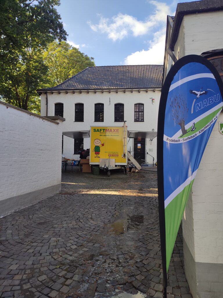 Am Folgetag ist die mobile Mosterei wie im vergangenen Jahr in Gangelt im Einsatz. Die Zusammenarbeit vom NABU Selfkant mit Saftmaxe bietet neben Obstwiesenbesitzern allen Interessierten die Möglichkeit, auch große Mengen Obst als Saft konserviert für lange Zeit nutzen zu können.