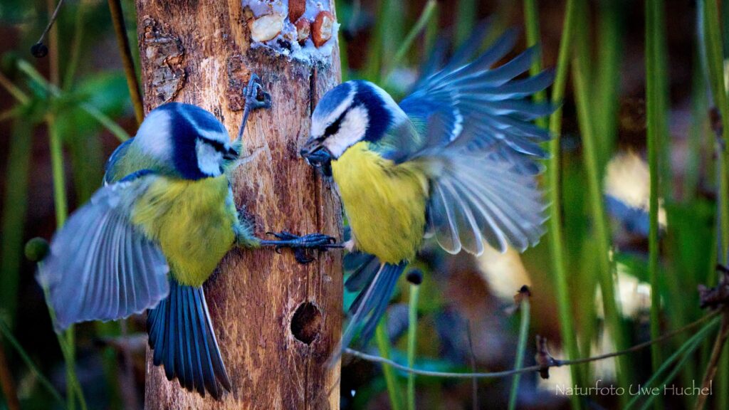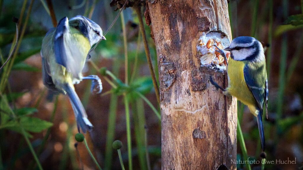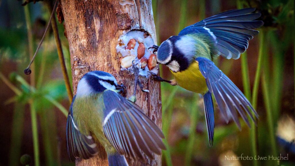 Im Bild eine Futterstelle, die von Spechten, Meisen, Rotkehlchen und auch Amseln angenommen wird. Speziell Amseln und Rotkehlen brauchen etwas Übung um hier zu fressen. (Rinderfett, Haferflocken, Mehlwürmer, Sonnenblumenkerne und Erdnüsse – ist selbst zubereitet günstiger und man kann testen, was die Vögel mögen) Diese Futterstelle hat auch den Vorteil, dass die Vögel sich nicht eine Nuß oder Sonnenblumenkern einfach wegnehmen können. Sie bleiben länger sitzen, ggf. interessant für Kinder zum beoachten. (Fotografen haben auch ihren Spaß)