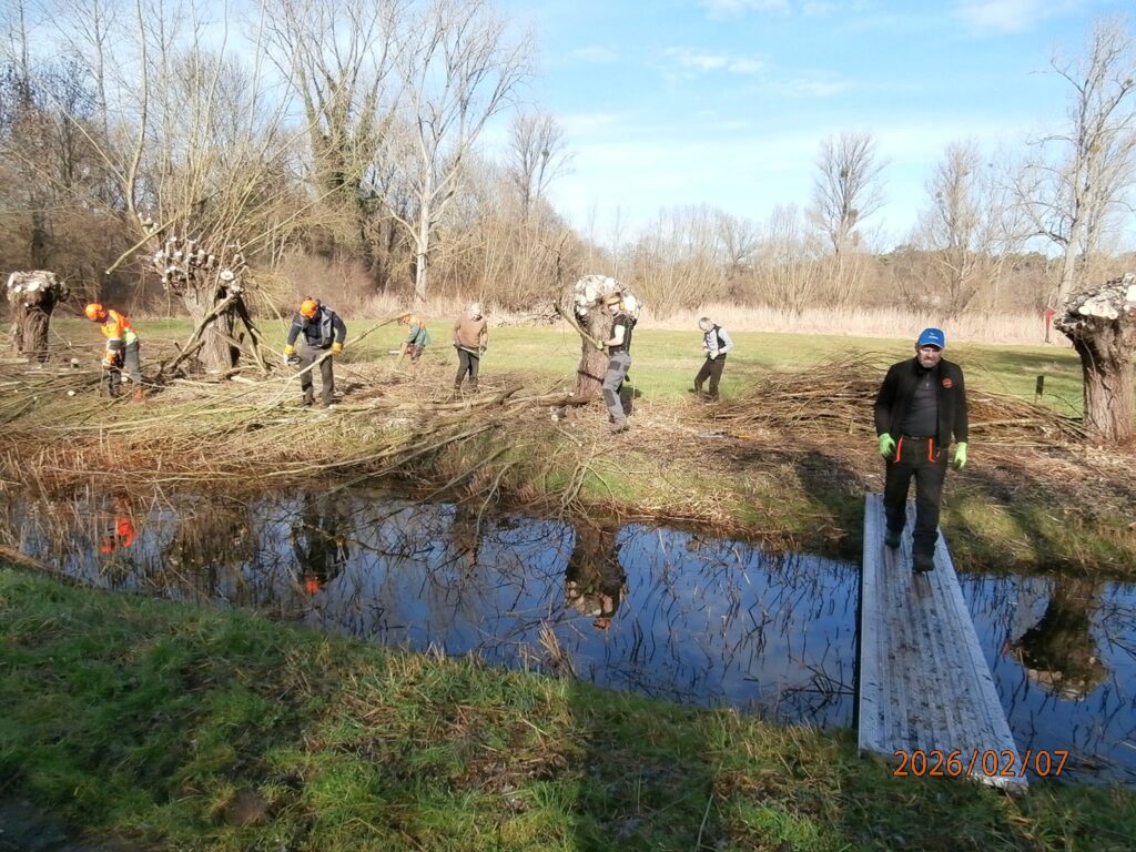 Der letzte Arbeitseinsatz der Saison 2025/2026 wurde u.a. genutzt, den Naturwerktag am 28. Februar 2026 vorzubereiten. Insgesamt sechzehn Aktive haben bei bestem Wetter die Kopfweidenreihe am Rodebach vollständig gepflegt. Das Arbeitsgebiet lag auf der dem Weg gegenüberliegende Uferseite. Die mühsame Überquerung des Bachlaufs wurde durch den erstmalige Einsatz einer Hilfsbrücke deutlich erleichtert.